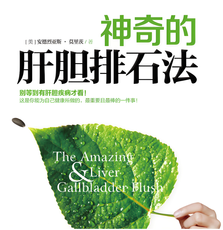 《神奇的肝胆排石法》(安德斯·莫瑞茨),我二十年前就实践过,没想到现在得到了广泛的认知。几乎所有身体的问题都从肝胆结石开始,医院只能发现很严重的胆结石,所以很多人出现肝内胆管结石是没有被发现的,而这成了新陈代谢紊乱和种种病症的根源。这本书讲到的排毒方法,可以边吃边进行,人们容易接受,但需要时间一周之久。我在实践中变动了一下,用三天就可以了,我是这么做的,您不妨一试。任何病的康复都从肝胆排石开始;并且对付胆结石,自然疗法,比医院动手术取了又复发、甚至摘除胆囊,不知要好多少,这一点不言而喻、毋容置疑。